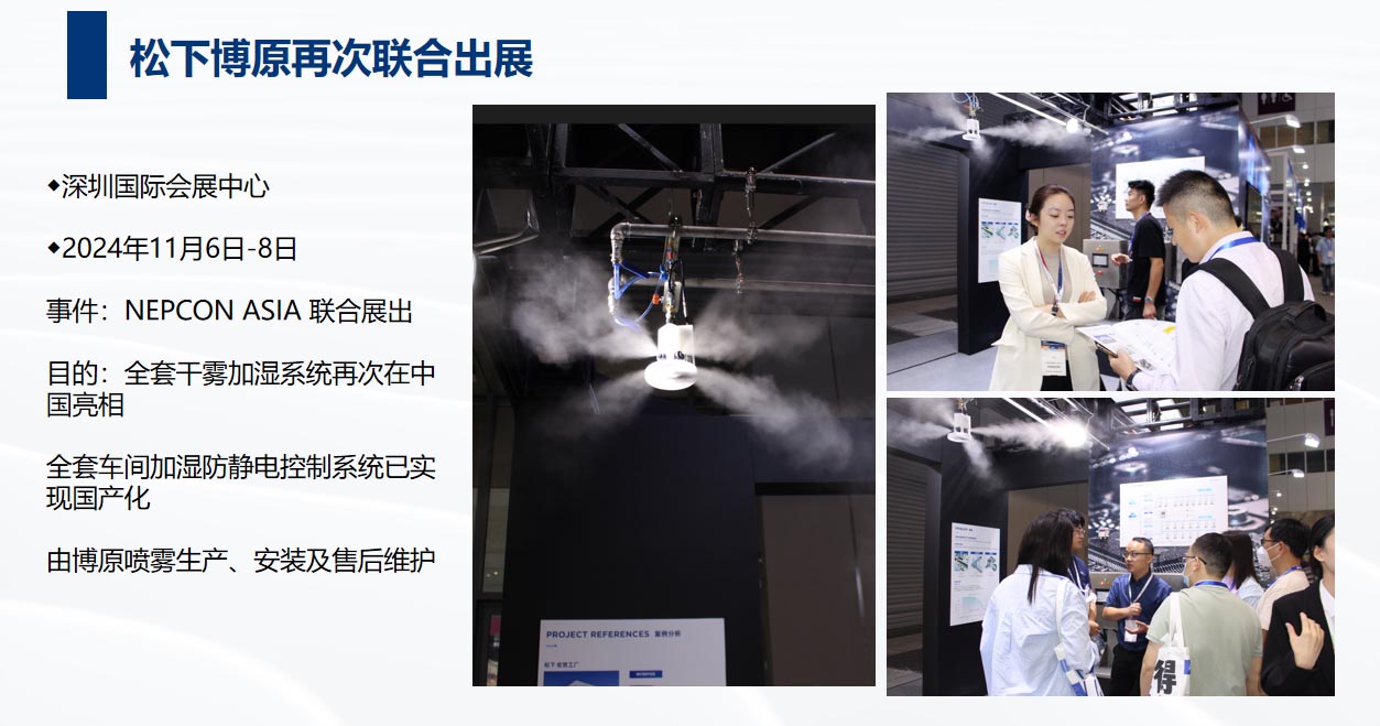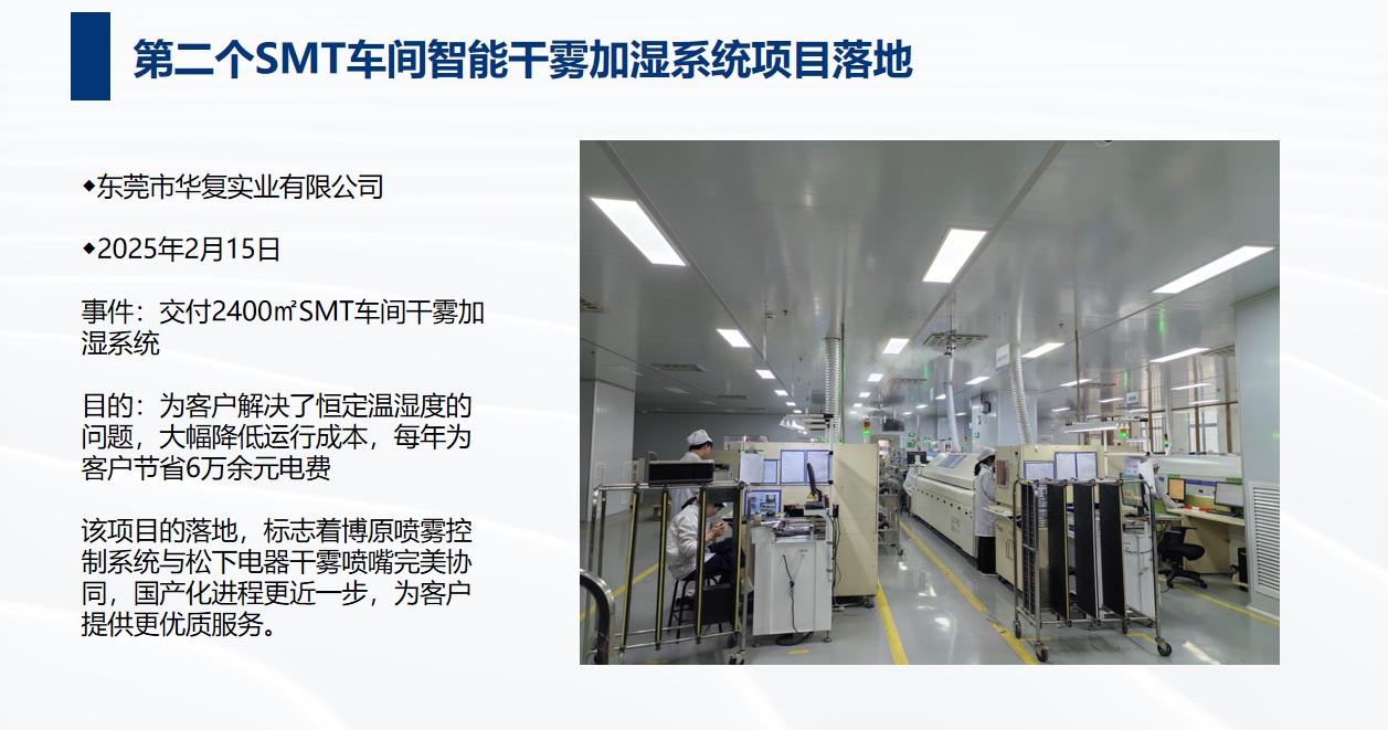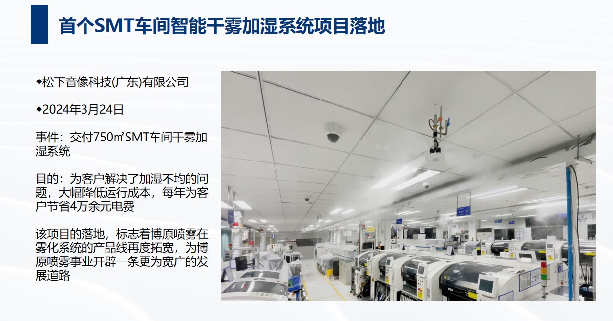 雙方于2023年簽訂MOU戰(zhàn)略合作協(xié)議,目前水霧項(xiàng)目穩(wěn)定有序的開展,兩個(gè)SMT車間智能加濕項(xiàng)目完美落地,噴霧控制系統(tǒng)已實(shí)現(xiàn)國產(chǎn)化,后續(xù)雙方會(huì)持續(xù)優(yōu)化產(chǎn)品及項(xiàng)目流程,為用戶提供更優(yōu)質(zhì)的服務(wù)。