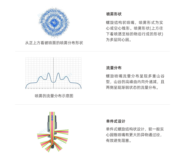 內部為大流量通道設計,最大程度地減少液體阻塞。螺旋噴嘴產生實心(空心)錐形噴霧,液滴相對較為粗糙。