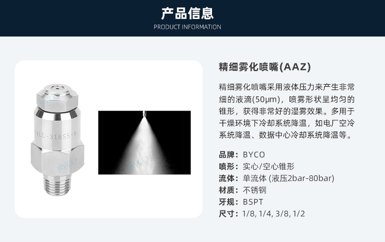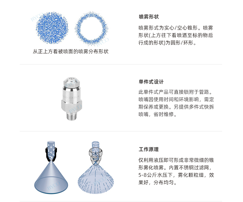 液滴大小為非常細小,形成霧狀噴霧效果。壓力和流量適用范圍廣。