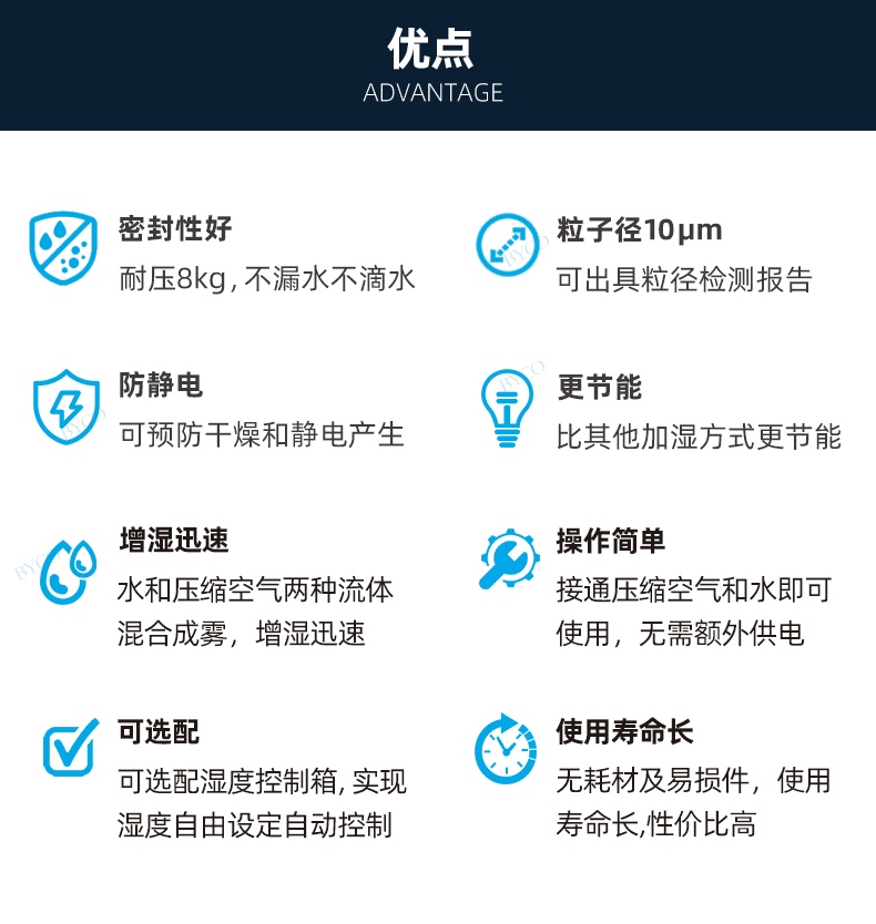 噴射距離達(dá)4M以上;可預(yù)防干燥和靜電產(chǎn)生;與其他加濕方式相對(duì)更節(jié)能