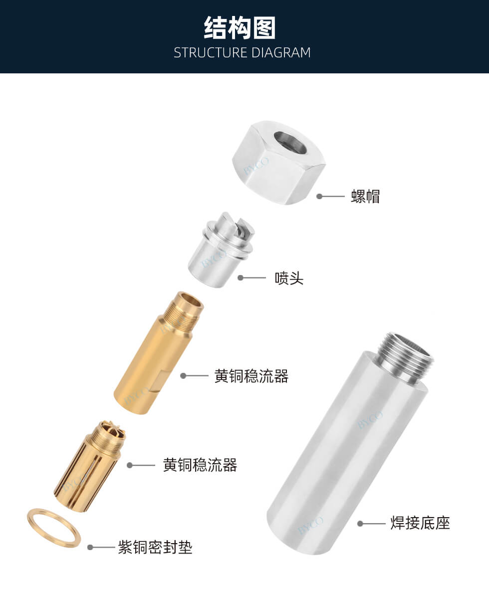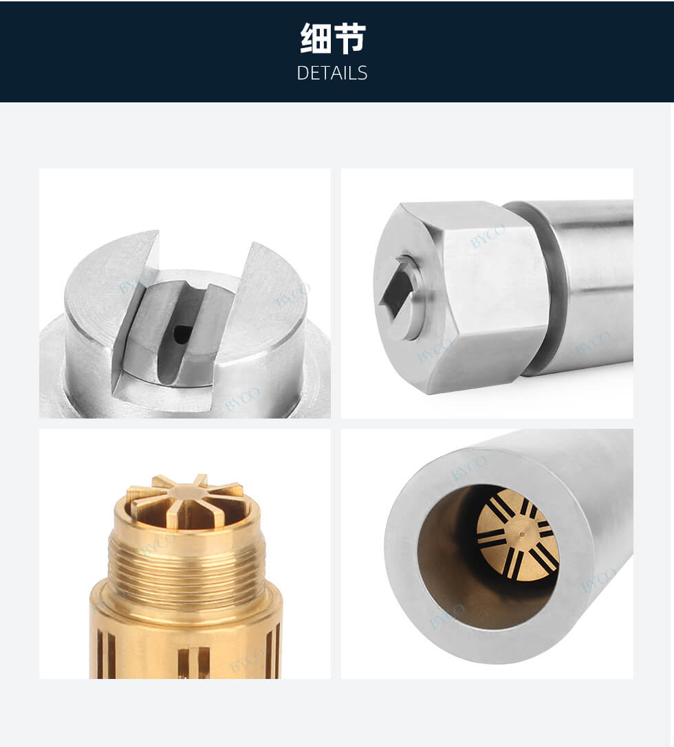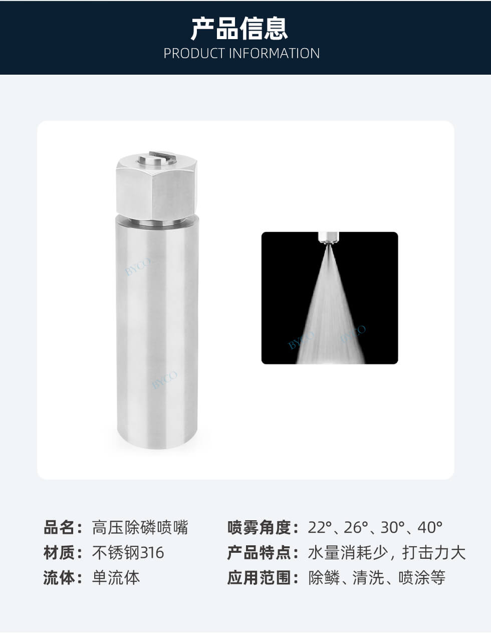 特點:較一般的高壓除磷噴嘴,增加了整流器減少紊流,經過整流后高壓水流態,噴射出的呈扇形的高速水簾較一般噴嘴打擊力大大增強,打擊力的分布更均勻,除磷效果更好。